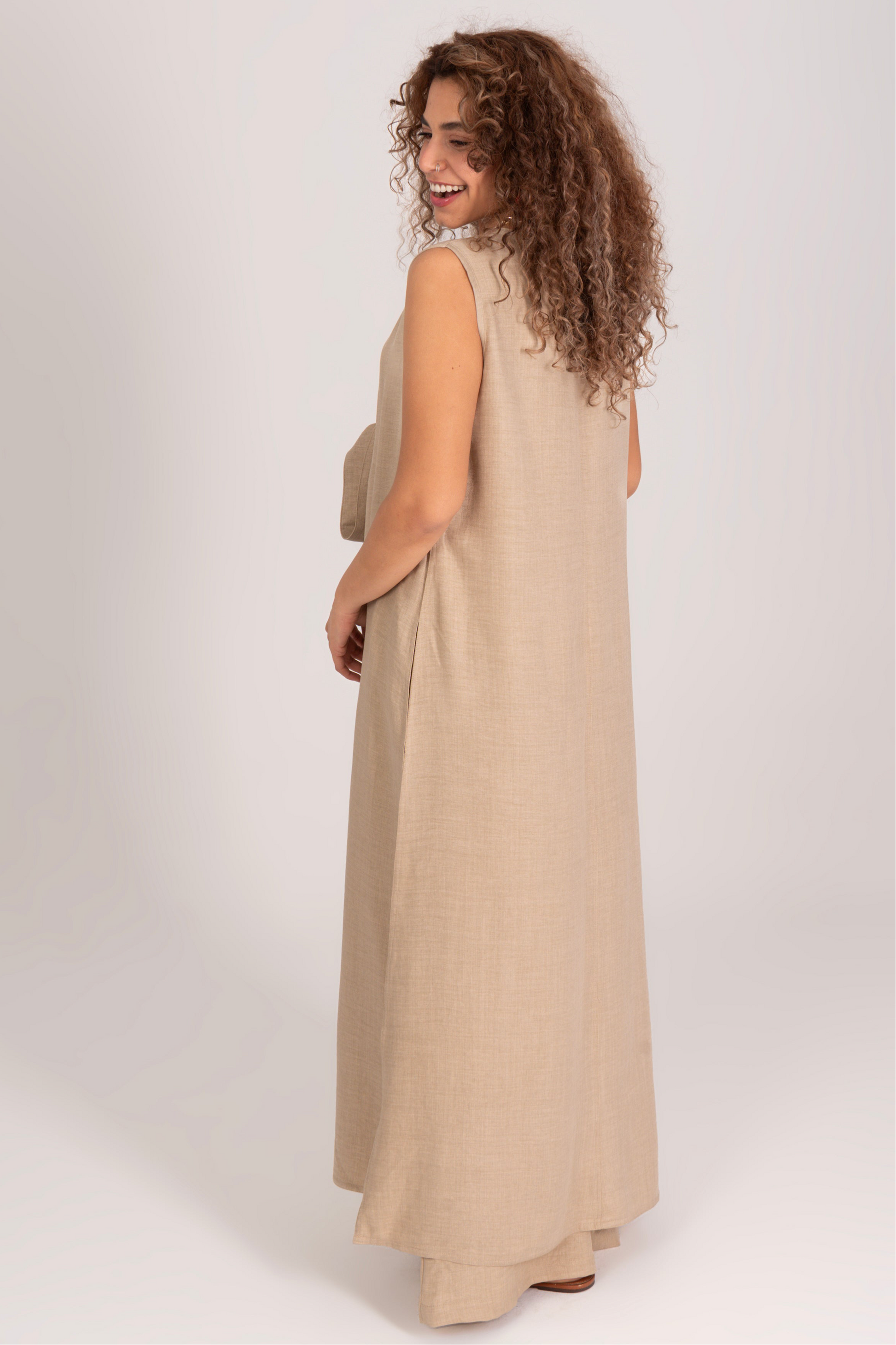 Experience style and comfort like never before with the Sand Dune Linen Set. This set comes with a chic, flowy vest and relaxed wide-leg pants that boast high side slits and an elastic waist for effortless wear. Plus, with two convenient side pockets, you'll have all-day comfort and convenience.
