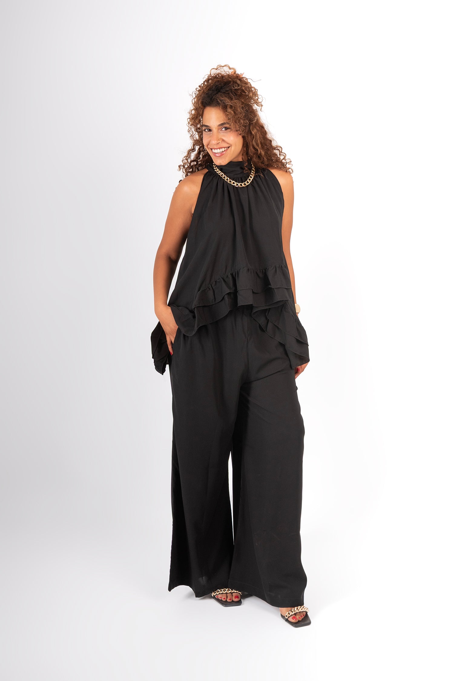 A set of 2 pieces, wide leg pants with pockets and elastic waistband & sleeveless high neck top with ruffles hem